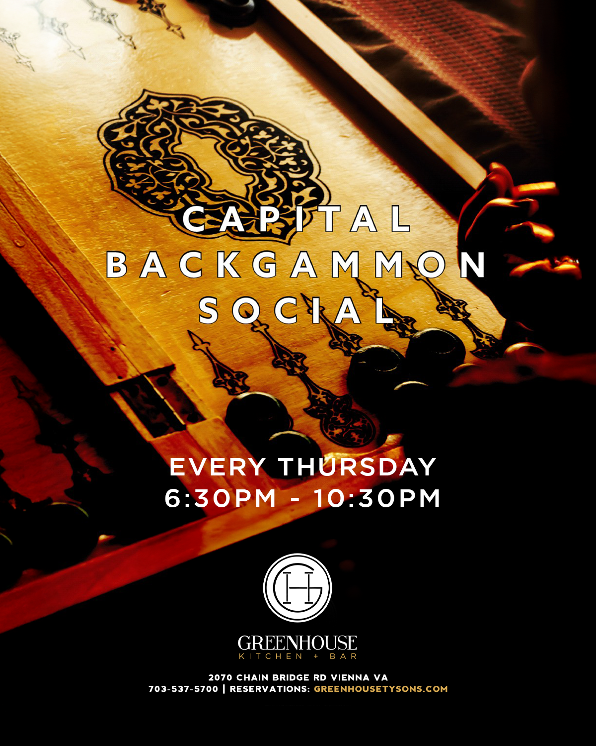 #BackgammonNights #GreenhouseKitchenDC #TysonsCornerEvents #DCGameNight #LuxurySocialHour #ThursdayVibes